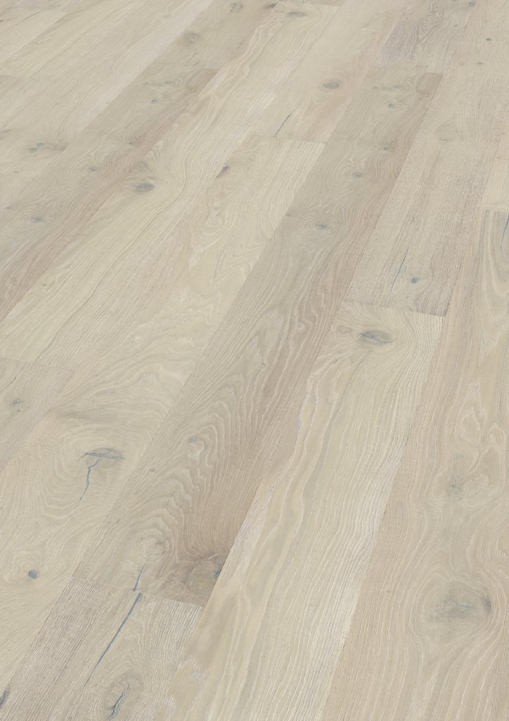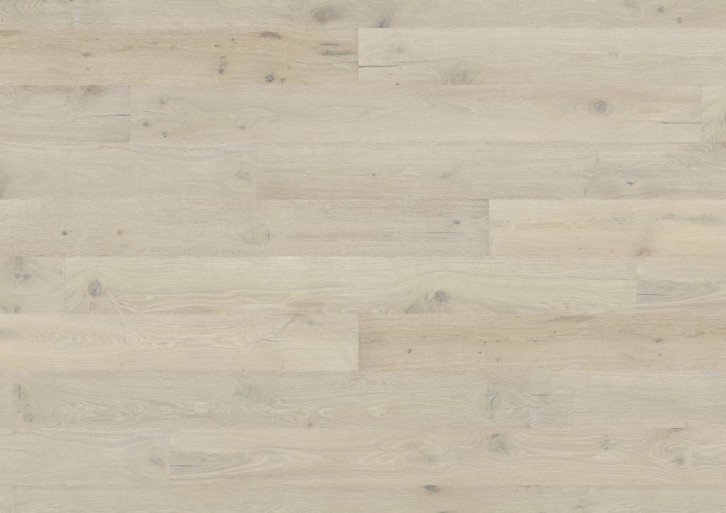 The Oak No.30 – Cotswolds wide plank is truly handcrafted: the rough-sawn wood is carefully brushed so you can feel its natural structure. With great finesse, a white stain is applied to subtly highlight the grain before a white oil refines and protects each plank. The result is a light, powdery colour effect reminiscent of sun-drenched limestone facades – a masterpiece of craftsmanship from the Shire Landscapes collection.